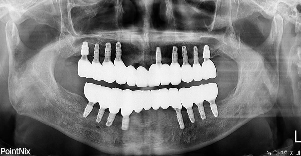 잇몸뼈가 소실되어 남은 영구치를 모두 발치하고 전악 임플란트를 한